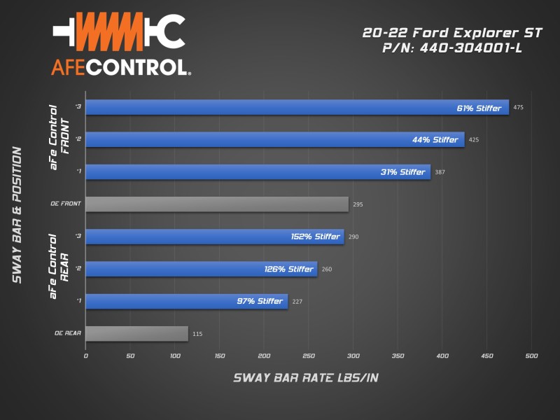 Dramatically reduce body roll without sacrificing ride quality with aFe CONTROL*s Explorer ST sway bars. Our 3-way adjustable rear sway bar will allow you to easily dial in the handling balance of your ST. Sharpened steering response will improve initial turn-in making your Explorer feel lighter and more agile. The added stability and control are also welcome when hauling loads on your roof rack or towing. Whether you*re on a road trip with the family or canyon carving in the mountains, aFe CONTROL will get you there. Every aFe CONTROL sway bar is CAD designed and CNC bent to strict tolerances. This insures precise fit and perfect operation. Our rear sway bar is 3-way adjustable. This allows the driver to dial in the rear roll resistance to achieve the desired handling bias. The rear sway bar utilizes laser cut end plates. These are robotically welded to the bar in a dedicated fixture to insure accurate hole positioning and consistent manufacturing. aFe CONTROL includes low-deflection polyurethane bushings and premium 6061-T6 aluminum black anodized billet brackets which are equipped with grease fittings for easy maintenance.