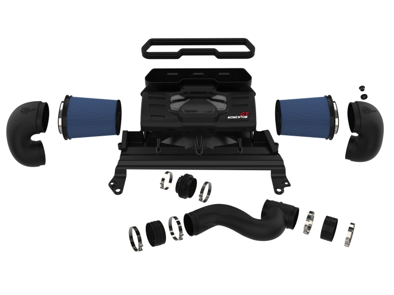A pair of 360-degree radial flow air filters feature our pre-oiled Pro 5R media with five layers of progressively finer cotton gauze media for maximum performance. Our Pro 5R media provides your engine with the largest amount of high-flowing air, usually resulting in the highest power gains out of all other filter media options. This media is perfect for street use. The inverted tops make for more filter surface area, resulting in longer service intervals. Momentum*s innovative filter-to-housing interface was built to feature the largest air filter possible. Once the system is installed, the air filters can be easily removed from the housing for maintenance by only uninstalling the side intake tubes. The smooth one-piece sealed housing, constructed of heat-resistant cross-linked polyethylene (XLPE), features our patent pending filter-to-housing interface. Its innovative design minimizes the total number of parts, making for an easy installation. A massive clear sight window allows for hassle-free filter inspection without having to disassemble your intake system. The housing incorporates both the factory hood air inlet scoop and the grille inlet using no additional hardware. This system features a trio of high quality, computer-designed, dyno-tuned intake tubes to achieve maximum power gains while maintaining a perfect fit. Our XLPE material is heat soak resistant and extremely durable. Stainless-steel clamps are included for strength, and a premium silicone coupling allows for ample flexibility and durability. Momentum GT intakes are designed with fewer parts for a fast and easy installation.