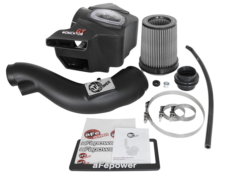 Unique One-Piece Housing: The smooth one-piece sealed housing with auxiliary air scoop is used to eliminate the use of multiple-piece housings and ensure the coolest air intake charge available. A urethane plug is also included for those cold weather applications where you want to block the auxiliary air scoop. A large, clear sight window is used for a hassle-free filter inspection and an aggressive style. (US PAT 9440175) For Filter-to-Housing Interface. Roto-mold Tube: This System uses a two piece CAD designed, dyno-tuned, roto-mold intake tube to achieve maximum power gains while maintaining a perfect fit. Huge 3-Layer Performance Air Filter: The Momentum GT is designed around an oil-free, large 8″ Tall round inverted top 360 degree radial flow performance air filter with 3-layers of progressive finer porosity synthetic media providing maximum convenience. The unique air filter to housing interface (patent pending) allows for maximum filter size which increases the available air volume while simplifying the installation process. Premium Hardware: Premium stainless steel T-bolt clamps and a urethane hump coupler are used for strength and durability while also providing the most secure installation available. Momentum GT intakes are designed with fewer parts for a quick and simple installation.