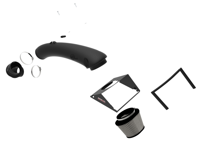 This 5-3/4* tall 360-degree radial flow air filter features a 5-1/2″ flange and our oil-free Pro DRY S media with three layers of synthetic media for maximum convenience. Its progressive layering provides great filtration efficiency and dust holding capacity, while not requiring the use of oils. This media is best suited for street use. Its inverted top makes for more filter surface area, resulting in longer service intervals.aFe POWER developed this heat shield to snap onto the top of the lower half of the factory air box to provide a hassle-free installation utilizing factory mounting locations. This system features a high quality, computer-designed, dyno-tuned intake tube to achieve maximum power gains while maintaining a perfect fit. Its XLPE (cross-linked polyethylene) material is heat soak resistant and extremely durable. The computer designed system utilizes factory mounting locations, minimizing the use of unnecessary hardware, and ensuring a perfect fit every time. This is a direct bolt-on kit that requires no cutting or drilling on factory parts. Stainless-steel clamps are included for strength, and a premium silicone coupling allow for ample flexibility. This air intake system works perfectly in combination with aFe POWER D.A.S. (Dynamic Air Scoop): 52-10010S(Black), 52-10010SR(Red) and 52-10010SL(Blue).