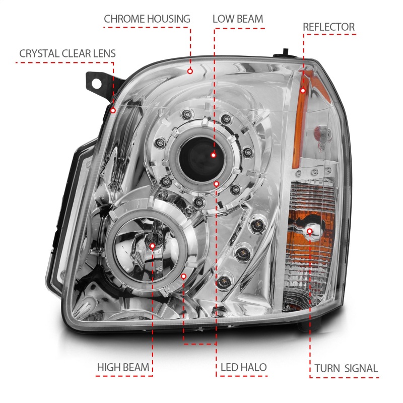 Projector Headlight Set w/Halo; Clear Lens; Chrome Housing; RX Halo; w/LED Parking/Projector/Halo; Pair;