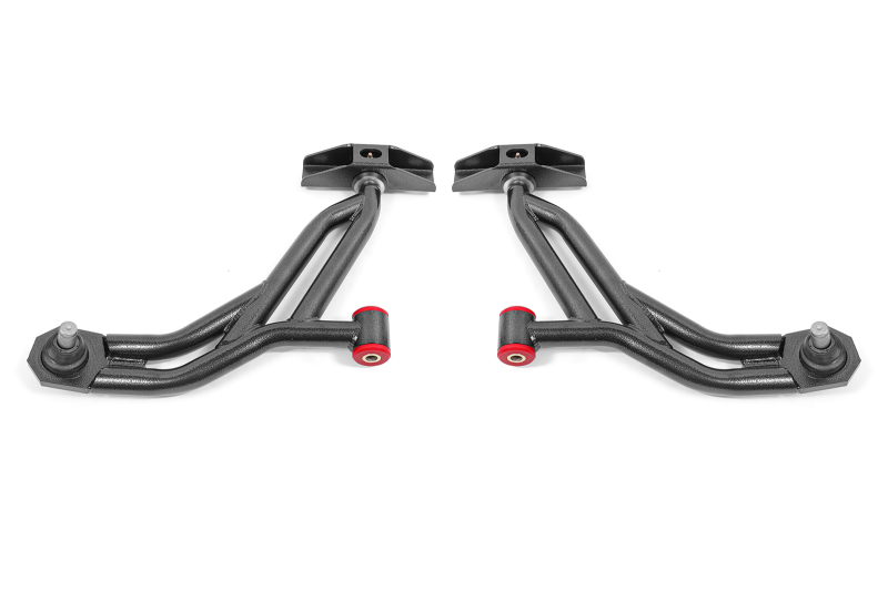 A-arms are one of the most important, yet overlooked suspension components. They are the direct link between the front wheels and the chassis. Any deflection causes a change in alignment, which results in poor performance and driving feel. Fabricated from heavy-duty 1.25-inch, 0.120-inch wall DOM tubing, deflection is eliminated with A-arms from BMR Suspension. BMRs AA755 Lower A-arms are equipped with greasable heavy-duty ball joints, greasable Delrin bushings (rear mount) to handle the high loads, and zinc-plated, X-series, heat-treated, chrome-moly, self-lubricating, Teflon-lined rod ends for loads of adjustability. Solid mounts give you a more responsive feel over the stock rubber bushings. BMRs bushings allow grease to evenly coat the inner sleeve. This efficient lubrication ensures quiet, reliable operation over the life of the bushings. The combination of rod ends and Delrin bushings gives you improved steering feel and responsiveness for any for of driving. BMRs AA755 lower A-arms eliminate A-arm deflection, greatly improving steering feel and response in normal and performance driving situations. The rod ends and Delrin bushings add strength and reduce deflection over the stock rubber bushing. The means you get great performance. Designed for street performance, drag race, and handling, and pro-touring applications, BMR lower A-arms are engineered to give you improved geometry and increased lateral grip during cornering situations. BMR Suspension AA755 Adjustable Lower A-arms are available in black hammertone and red powdercoat for long-lasting good looks. Installation time is 3-4 hours. Proudly made in the U.S.A. Control arm hardware kit RH014 (Includes upper and lower control arm hardware – Highly Recommended) also available.