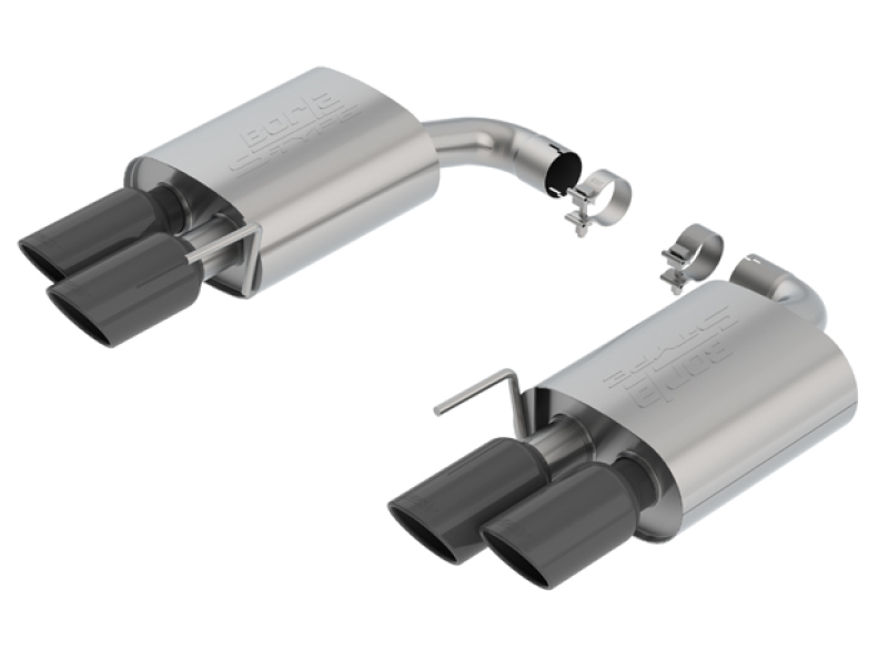 Borla(r) Axle-Back exhaust system 11953BC is designed to fit the 5.0L Mustang GT that is NOT equipped with Active Valve Performance Exhaust. It fits both the coupe and convertible models. The 2.5″ diameter system delivers the classic S-Type sound with no drone inside the vehicle. It features dual 4″ round black chrome on T-304 stainless steel tips on each muffler. Using Borla(r) Stainless Steel Polish p#21461 is NOT recommend with these black chrome tips. We suggest cleaning the tips with hot water and a microfiber cloth. A system with bright chrome on T-304 stainless steel is also available. By adding Borla(r) X-Pipe with Mid-Pipes part number 60705 you can create a Cat-Back(tm) system for your Mustang GT. Borla(r) Cat-Back(tm) & Axle-back exhaust systems feature patented multi-core technology designed to unleash hidden horsepower. Increased exhaust velocity adds power, driving excitement, fuel economy, and the distinctive Borla(r) Sound of Power respected by motoring enthusiasts everywhere. Each system is built from premium T-304 stainless steel, superior to T-400 series knockoffs (such as 409), to give you the absolute best in performance and durability. Ultra-smooth mandrel bends ensure maximum flow & power, and precision computer numerical control (CNC) manufacturing ensures an accurate fit. Best of all, Borla(r) stands behind every system with a Million-Mile Warranty. Just what you’d expect from the world’s most experienced (and most winning) exhaust brand.