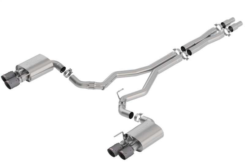 System will fit Bullitt models. NOT recommended for use on Convertibles. This 3″ diameter high flow Cat-Back(tm) system was designed specifically for the Mustang GT and has Active Exhaust Valves. The system contains a Merge X-Pipe for increased performance and improved sound. The system has Borla(r)’s Polyphonic Exhaust Harmonizer Technology with utilizes patented units that contain pipes of different diameters and lengths to create multiple exhaust notes that harmonize to deliver a clean, rich, full-bodied sound to the Borla(r) mufflers. The mufflers then enhance this sound to the character and volume of the aggressive ATAK(r) sound, with no drone inside the vehicle. The exhaust exits thru dual 4″ round carbon fiber with black anodized center tips on each muffler. Systems with bright chrome on T-304 stainless steel tips, and black chrome on T-304 stainless steel tips are also available. Borla(r) Cat-Back(tm) and Axle-Back multi-core technology is designed to unleash hidden horsepower. Increased exhaust velocity adds power, driving excitement, fuel economy, and the distinctive Borla(r) Sound of Power respected by motoring enthusiasts everywhere. Each system is built from premium T-304 stainless steel, superior to T-400 series knockoffs (such as 409), to give you the absolute best in performance and durability. Ultra-smooth mandrel bends ensure maximum flow & power, and precision computer numerical control (CNC) manufacturing ensures an accurate fit. Best of all, Borla(r) stands behind every system with a Million-Mile Warranty. Just what you’d expect from the world’s most experienced (and most winning) exhaust brand.