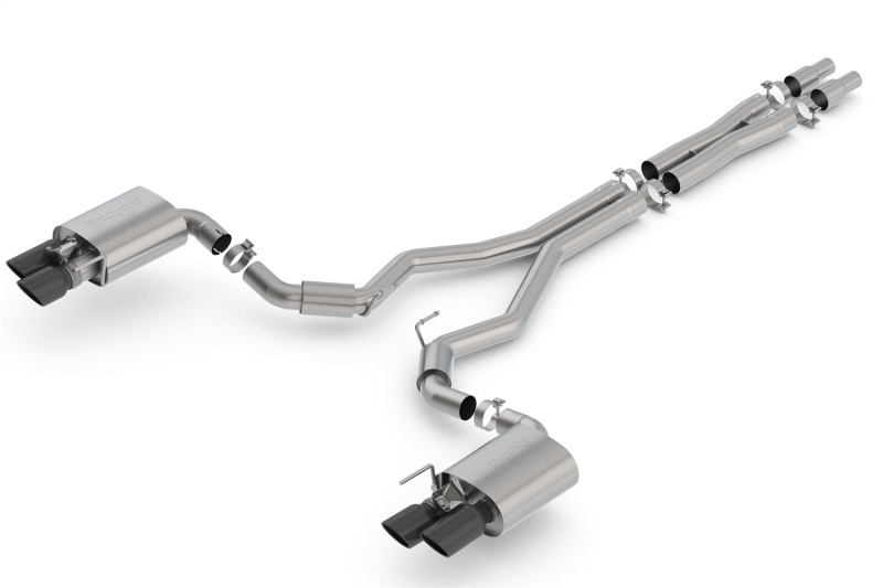 System will fit Bullitt models. NOT recommended for use on Convertibles. This 3″ diameter high flow Cat-Back(tm) system was designed specifically for the Mustang GT and has Active Exhaust Valves. The system contains a Merge X-Pipe for increased performance and improved sound. It delivers the classic S-Type sound with no drone inside the vehicle, It features dual 4″ round black chrome on T-304 stainless steel tips on each muffler. Using Borla(r) Stainless Steel Polish p# 21461 is System will fit Bullitt models. NOT recommended with these black chrome tips. We suggest cleaning the tips with hot water and a microfiber cloth. Systems with bright chrome on T-304 stainless steel tips, and carbon fiber tips are also available. Borla(r) Cat-Back(tm) and Axle-Back exhaust systems feature patented straight-through and multi-core technology designed to unleash hidden horsepower. Increased exhaust velocity adds power, driving excitement, fuel economy, and the distinctive Borla(r) Sound of Power respected by motoring enthusiasts everywhere. Each system is built from premium T-304 stainless steel, superior to T-400 series knockoffs (such as 409), to give you the absolute best in performance and durability. Ultra-smooth mandrel bends ensure maximum flow & power, and precision computer numerical control (CNC) manufacturing ensures an accurate fit. Best of all, Borla(r) stands behind every system with a Million-Mile Warranty. Just what you’d expect from the world’s most experienced (and most winning) exhaust brand.