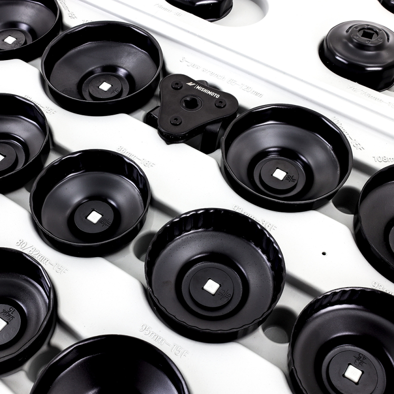 The Mishimoto 30 Piece Cup Style Oil Filter Wrench Set is a must-have tool to streamline oil changes for any professional or DIYer. This set features 30 precision-formed wrenches and covers standard sizes for domestic and import vehicles, ensuring compatibility across various makes and models. Each wrench provides a secure grip without crushing the oil filter, so say goodbye to struggling with ill-fitting tools.—-This set even includes a self-adjusting oil filter wrench, eliminating the need to bring multiple tools for those on-the-go projects. Additionally, the 1/2 in-drive adapter with a 21mm (13/16) wrench hex allows extra leverage with the use of a breaker bar or wrench.—-These oil filter wrenches from Mishimoto are designed to be durable and long-lasting, ensuring high quality and performance. Filter out the hassle and wrench your way to oil change success with the Mishimoto 30 Piece Cup Style Oil Filter Wrench Set. Just like the rest of our top-notch tools, this set is covered by the unbeatable Mishimoto Lifetime Warranty, ensuring your peace of mind and lasting reliability.?