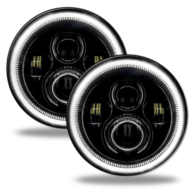 The Ultimate LED replacement headlight option for any vehicle with 7″ Sealed Beam lamps. The rugged design is perfect for your Jeep Wrangler, Off-Road Vehicle, Buggies, or Classic Car/ Truck. Installation is very easy with the included H4 and H13 Plug and Play connectors. Each set comes in full color retail-ready packaging and a 2-Year free Replacement Warranty. You can even choose optional colored Halos for even more customization! Improvements in brightness and reliability by adding a constant current LED driver to the main circuit board inside of the lamp to control the halos. NEW! No need for Anti-Flicker Wiring Adapters- The new SMART Integrated Can-Bus system automatically adjusts- preventing flicker issues. Increased Reliability- By conditioning the power going into the LEDs this prevents degradation which can shorten the overall lifespan of the product. Wider Input Voltage Range- The new SMD Halos can operate on a very wide voltage range from 12V-24V so that voltage spike can not damage the LEDs. Brighter LED Halos- by moving the heat load of the resistors off the PCB we are able to increase the number of LEDs on the circuit board without thermal issues. LED chips upgraded from a Cree LED to a Phillips Luxeon ZES chip. They deliver a very high efficacy 130LM/W ratio while having lower thermal output.