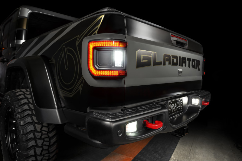 Designed to fit flush with the truck bed of the Jeep Gladiator, the new JT Flush Tail Lights from ORACLE Lighting offer new LED features and improved styling. This innovative design is a sleek tail light for Jeep Gladiators that wraps tightly around the truck. Protruding out significantly less than the factory tail lights, this low-profile design avoids damage while trail riding. Because of the nearly flush wrap-around design, the lighting can be visible from any rear angle, making it a unique solution for the Jeep. These Jeep Gladiator tail lights provide improved aesthetics and functional LED lighting features including high-powered reverse lights and signature perimeter lighting. In addition to standard features, the plug-and-play design features an enhanced reverse function and caters to the Jeep’s optional cross-traffic sensor. The reverse light features 12 high-powered LEDs for optimal rear illumination. The cross-traffic sensor can be swapped directly over from the factory assembly and easily installs into the ORACLE Lighting tail lights for Jeep Gladiator. These flush-mount tail lights are compatible with base and LED packages. Gain sleek styling that compliments the original body lines and tons of innovative features. With the superior quality and durability that ORACLE Lighting is known for, these tail lights are the perfect upgrade for your Jeep Gladiator!