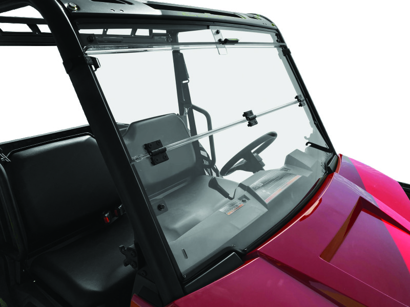 Folding windshield constructed from premium 0.177 in. thick, optically clear polycarbonate material that can be hinged up or down to increase or limit airflow in the cabin.