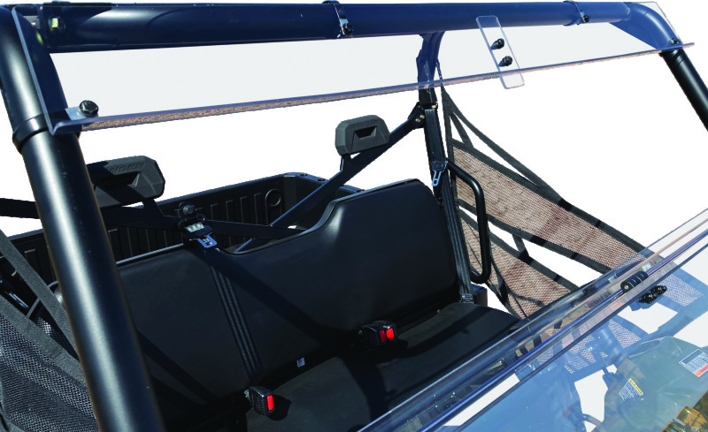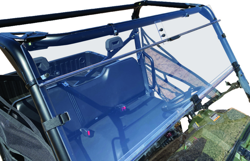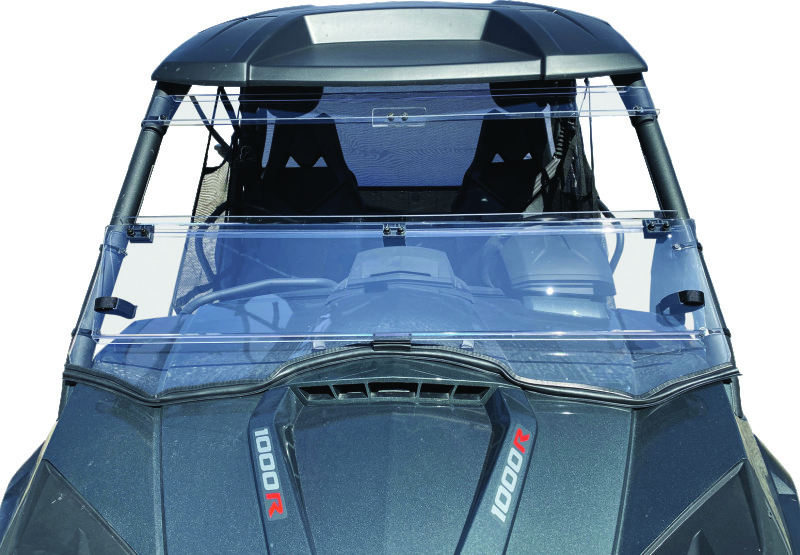 Folding windshield constructed from premium 0.177 in. thick, optically clear polycarbonate material that can be hinged up or down to increase or limit airflow in the cabin.
