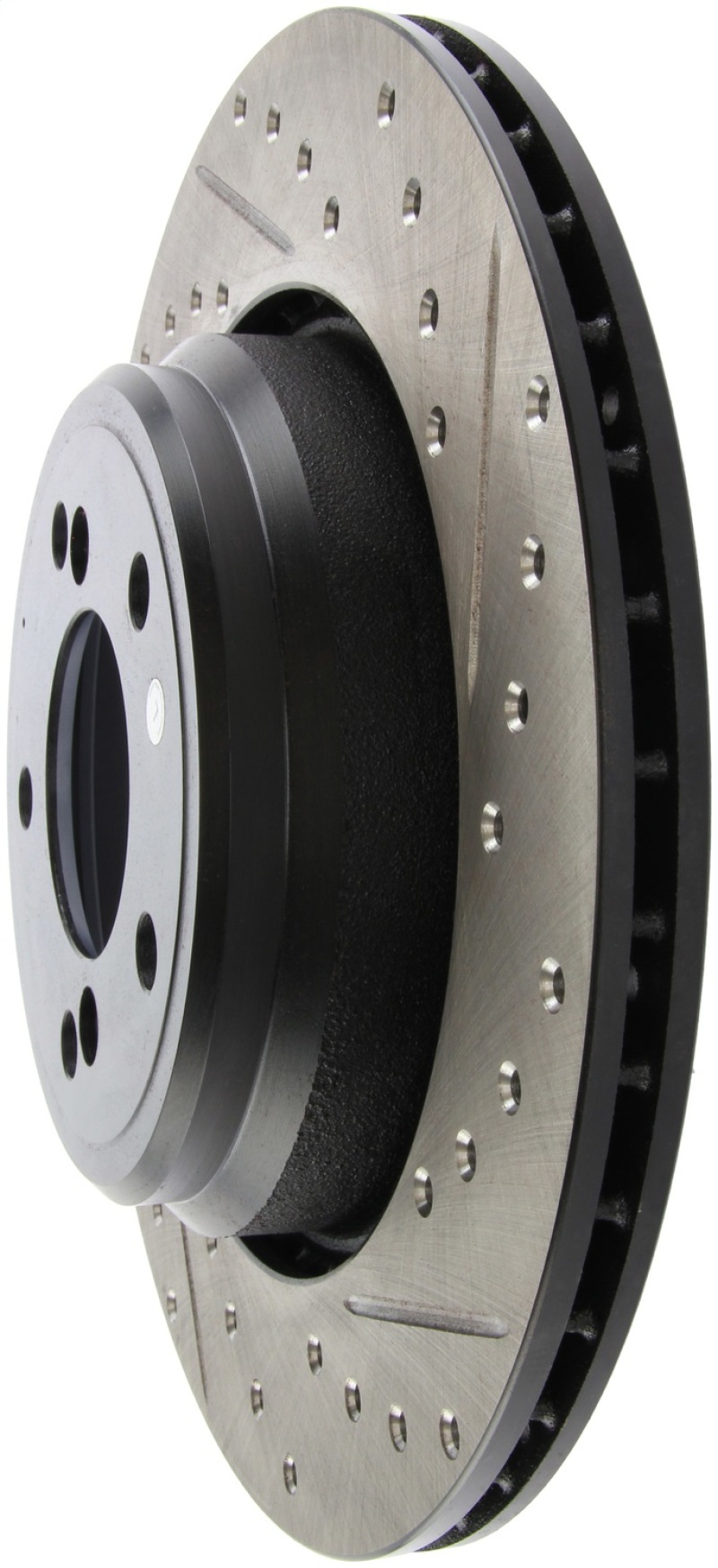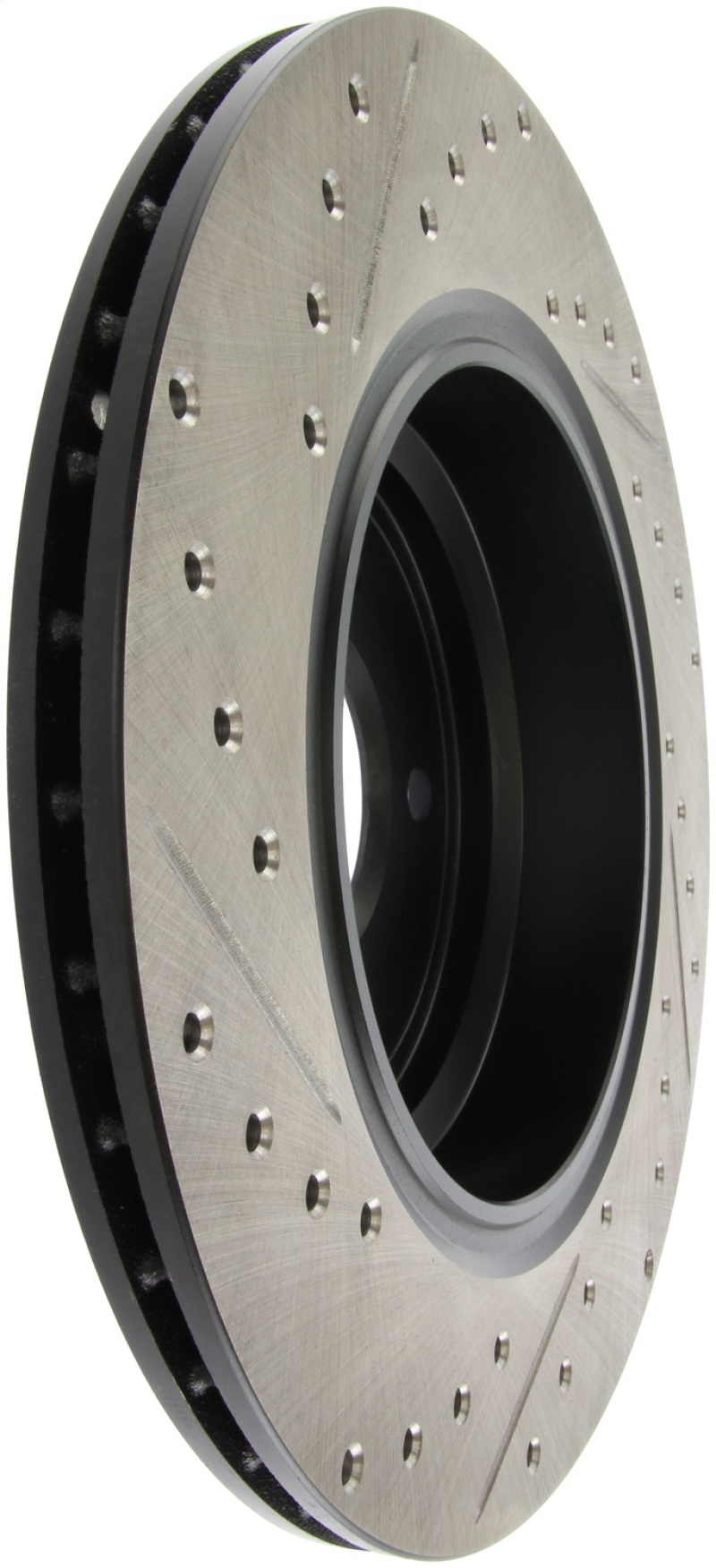 StopTech Drilled and Slotted Sport Rotors are 1-piece direct replacement brake discs for factory brake systems and stock calipers that look great behind your wheels * and offer significantly improved braking performance. The unique cross-drilling and slotting aids with heat and brake dust dispersal; prevents glazing of the pads; adds bite and improves wet and dry braking performance. Built to last; the black e-coating provides protection from corrosion and the high carbon metallurgy (in most applications) offers quieter operation; better crack resistance and increased performance.