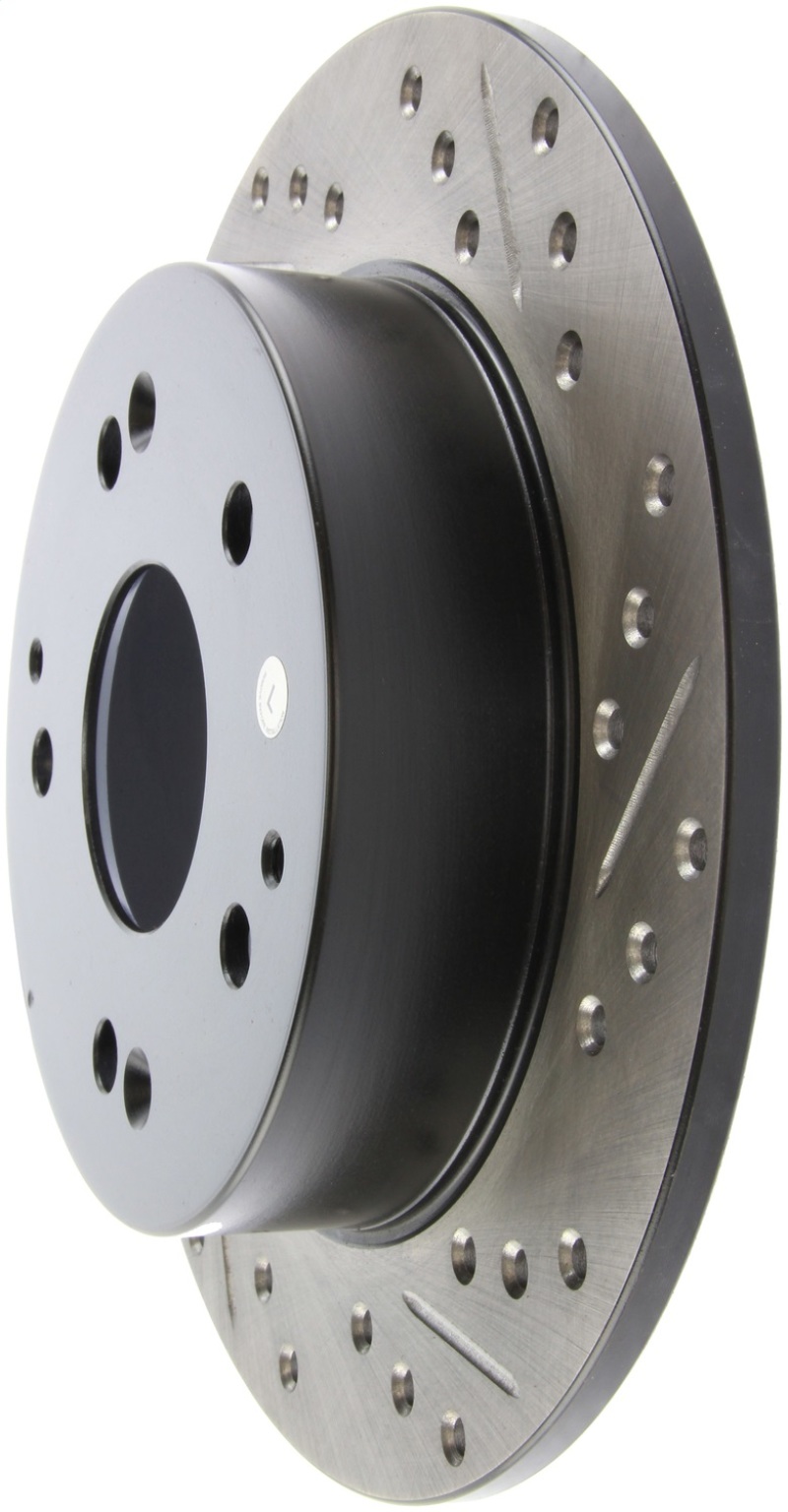 StopTech Drilled and Slotted Sport Rotors are 1-piece direct replacement brake discs for factory brake systems and stock calipers that look great behind your wheels * and offer significantly improved braking performance. The unique cross-drilling and slotting aids with heat and brake dust dispersal; prevents glazing of the pads; adds bite and improves wet and dry braking performance. Built to last; the black e-coating provides protection from corrosion and the high carbon metallurgy (in most applications) offers quieter operation; better crack resistance and increased performance.