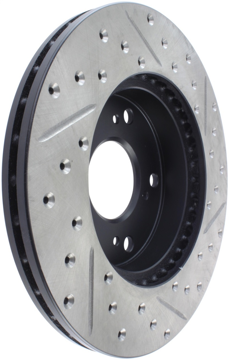 StopTech Drilled and Slotted Sport Rotors are 1-piece direct replacement brake discs for factory brake systems and stock calipers that look great behind your wheels * and offer significantly improved braking performance. The unique cross-drilling and slotting aids with heat and brake dust dispersal; prevents glazing of the pads; adds bite and improves wet and dry braking performance. Built to last; the black e-coating provides protection from corrosion and the high carbon metallurgy (in most applications) offers quieter operation; better crack resistance and increased performance.