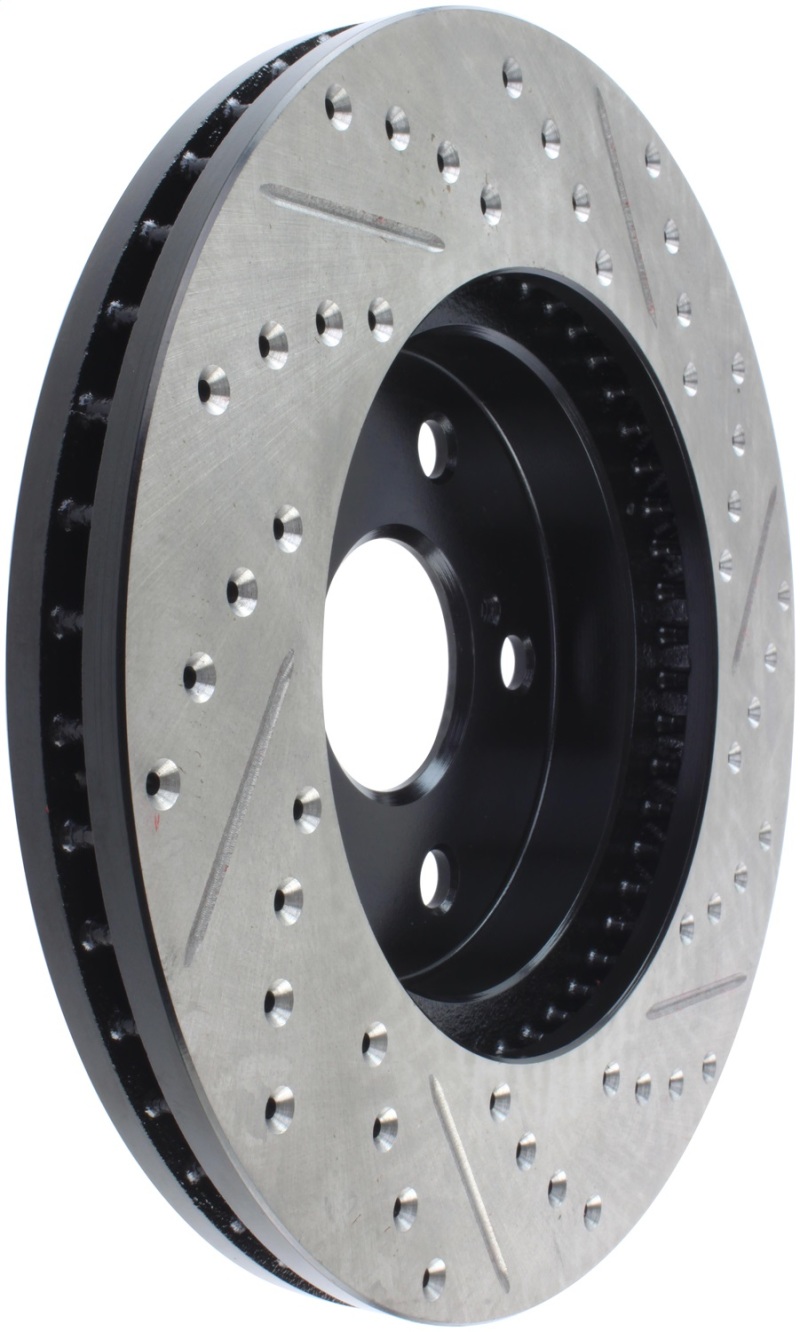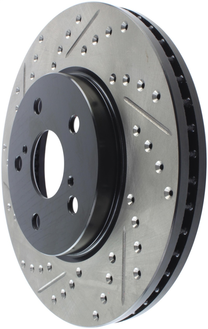 StopTech Drilled and Slotted Sport Rotors are 1-piece direct replacement brake discs for factory brake systems and stock calipers that look great behind your wheels * and offer significantly improved braking performance. The unique cross-drilling and slotting aids with heat and brake dust dispersal; prevents glazing of the pads; adds bite and improves wet and dry braking performance. Built to last; the black e-coating provides protection from corrosion and the high carbon metallurgy (in most applications) offers quieter operation; better crack resistance and increased performance.