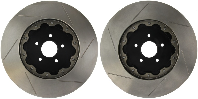 StopTech AeroRotor Replacement Kits ARK are designed to replace your vehicle’s original factory rotors; while retaining the factory brake calipers. Although the ARK is the same diameter and thickness as the factory rotors; it offers improved cooling; braking; and handling. The directional; floating AeroRotors allow independent expansion of the rotor and hat without “coning;” thanks to elongated drive pin holes. ARK components include AeroRotor friction rings with patented internal vane design; pre-assembled to billet aluminum AeroHats with directional stand-offs that optimize cooling airflow. The patented AeroRotor vane design pushes up to 80 percent more air than factory rotors for better cooling and reduced fade on the track. The aircraft-grade aluminum hats and 2-piece AeroRotors are up to 8 pounds lighter than stock rotors; allowing faster acceleration and deceleration; and improved handling. StopTech AeroRotors are available slotted or cross-drilled. These slots or holes allow better dissipation of heat; friction material and debris; assuring that fresh pad material is in contact with the rotor every time the brakes are applied. An optional anti-corrosion; zinc finish is available for customers in cold climates; where salt and chemicals are used to melt snow and ice. The zinc coating also benefits customers who prefer no visible surface rust on the vanes and outer circumference of the rotors. StopTech AeroRotors are 100 percent made in the USA.