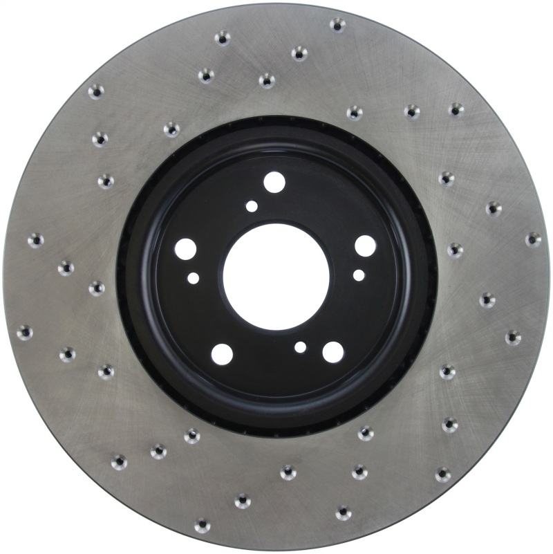 StopTech Drilled Sport Rotors are 1-piece direct replacement brake discs for factory brake systems and stock calipers that look great behind your wheels * and offer significantly improved braking performance. The unique cross-drilling aids with heat and brake dust dispersal; prevents glazing of the pads; adds bite and improves wet and dry braking performance. Built to last; the black e-coating provides protection from corrosion and the high carbon metallurgy (in most applications) offers quieter operation; better crack resistance and increased performance.