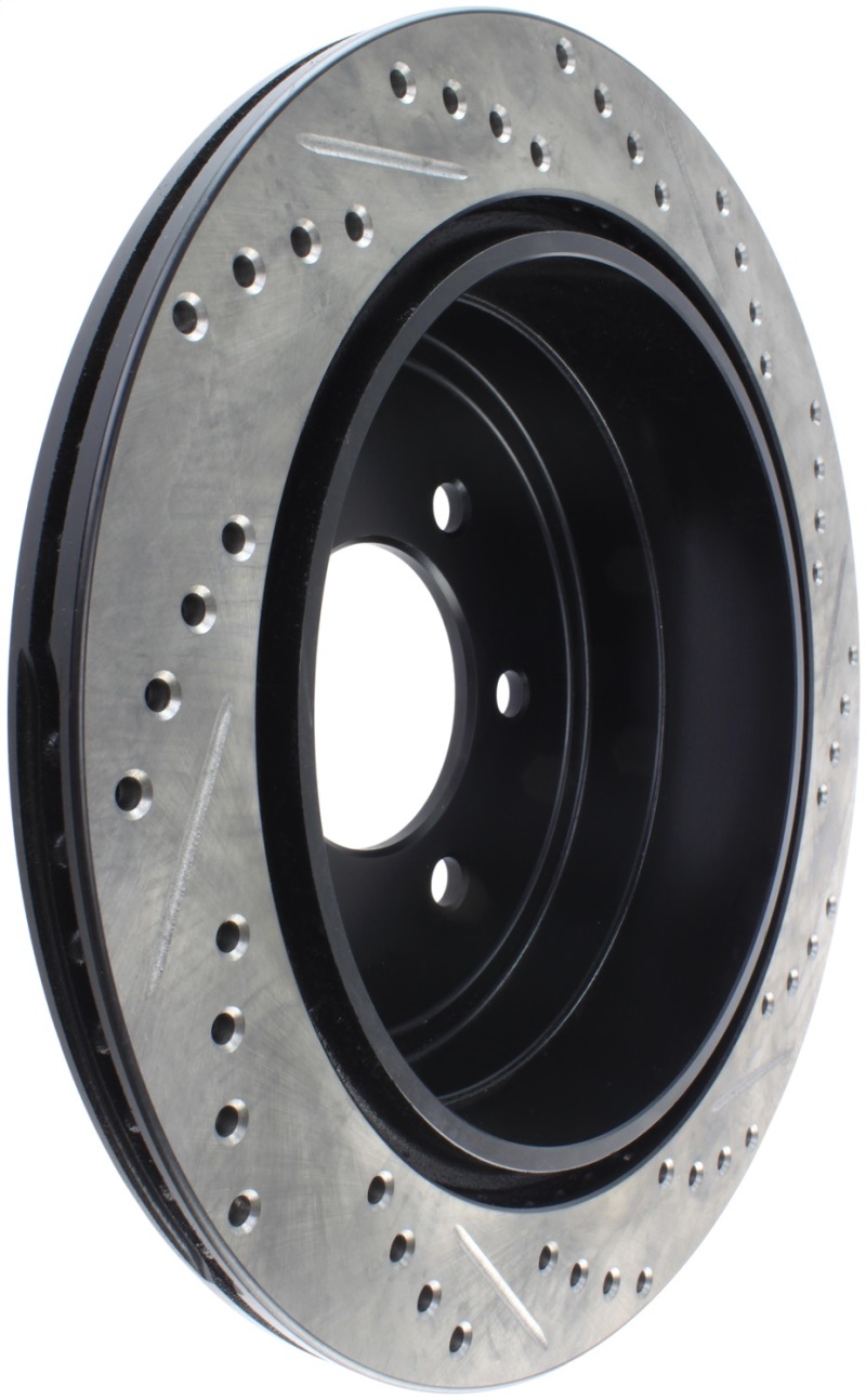 StopTech Drilled and Slotted Sport Rotors are 1-piece direct replacement brake discs for factory brake systems and stock calipers that look great behind your wheels * and offer significantly improved braking performance. The unique cross-drilling and slotting aids with heat and brake dust dispersal; prevents glazing of the pads; adds bite and improves wet and dry braking performance. Built to last; the black e-coating provides protection from corrosion and the high carbon metallurgy (in most applications) offers quieter operation; better crack resistance and increased performance.