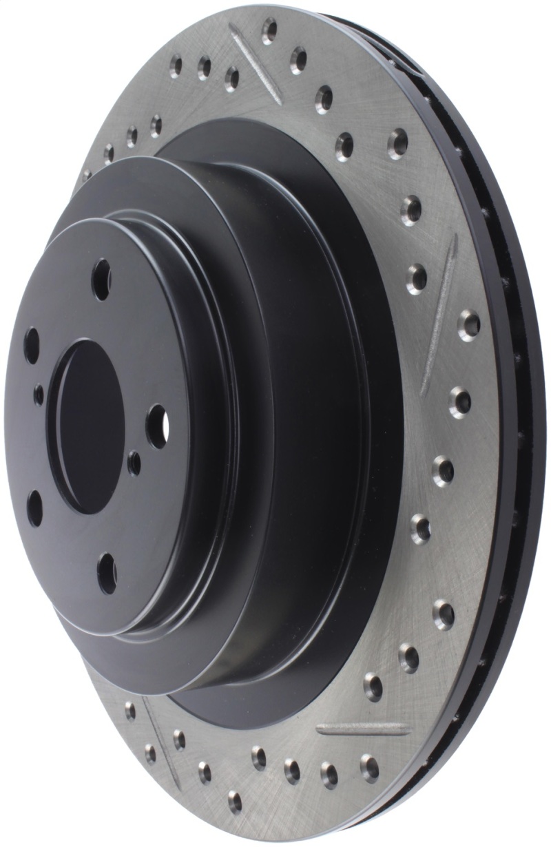 StopTech Drilled and Slotted Sport Rotors are 1-piece direct replacement brake discs for factory brake systems and stock calipers that look great behind your wheels * and offer significantly improved braking performance. The unique cross-drilling and slotting aids with heat and brake dust dispersal; prevents glazing of the pads; adds bite and improves wet and dry braking performance. Built to last; the black e-coating provides protection from corrosion and the high carbon metallurgy (in most applications) offers quieter operation; better crack resistance and increased performance.