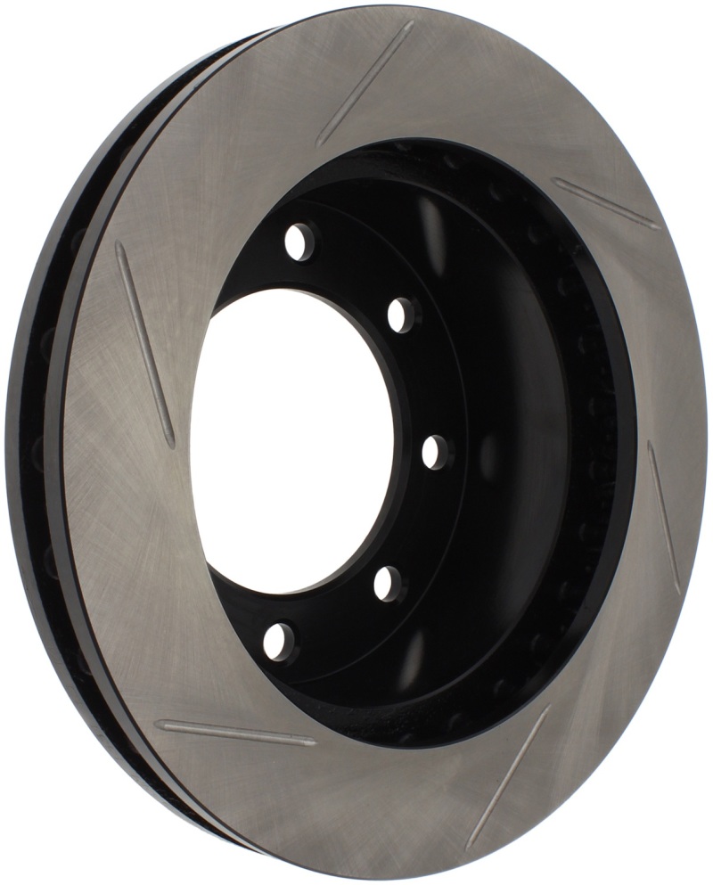 StopTech Slotted Sport Rotors are 1-piece direct replacement brake discs for factory brake systems and stock calipers that look great behind your wheels * and offer significantly improved braking performance. The unique slotting aids with heat and brake dust dispersal; prevents glazing of the pads; adds bite and improves wet and dry braking performance. Built to last; the black e-coating provides protection from corrosion and the high carbon metallurgy (in most applications) offers quieter operation; better crack resistance and increased performance.