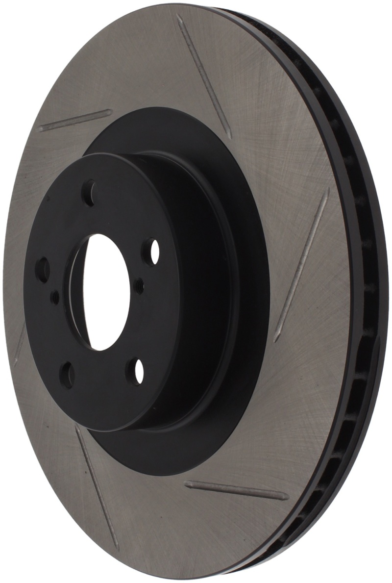 StopTech Slotted Sport Rotors are 1-piece direct replacement brake discs for factory brake systems and stock calipers that look great behind your wheels * and offer significantly improved braking performance. The unique slotting aids with heat and brake dust dispersal; prevents glazing of the pads; adds bite and improves wet and dry braking performance. Built to last; the black e-coating provides protection from corrosion and the high carbon metallurgy (in most applications) offers quieter operation; better crack resistance and increased performance.