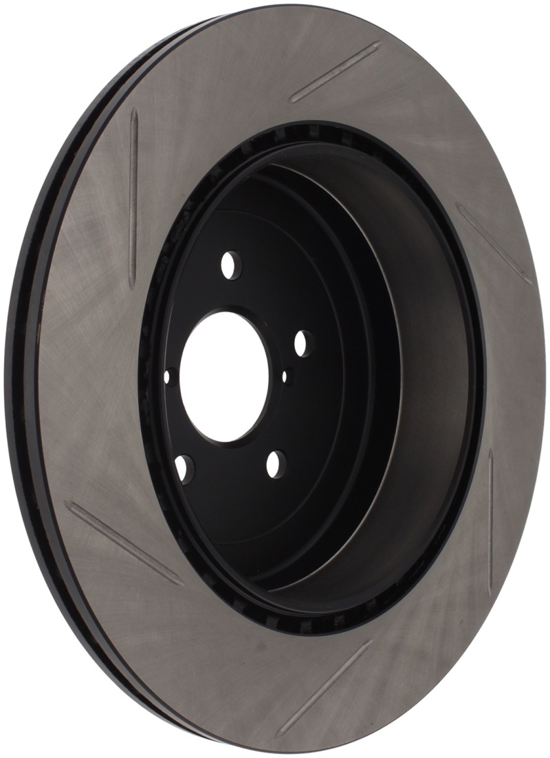 StopTech Slotted Sport Rotors are 1-piece direct replacement brake discs for factory brake systems and stock calipers that look great behind your wheels * and offer significantly improved braking performance. The unique slotting aids with heat and brake dust dispersal; prevents glazing of the pads; adds bite and improves wet and dry braking performance. Built to last; the black e-coating provides protection from corrosion and the high carbon metallurgy (in most applications) offers quieter operation; better crack resistance and increased performance.