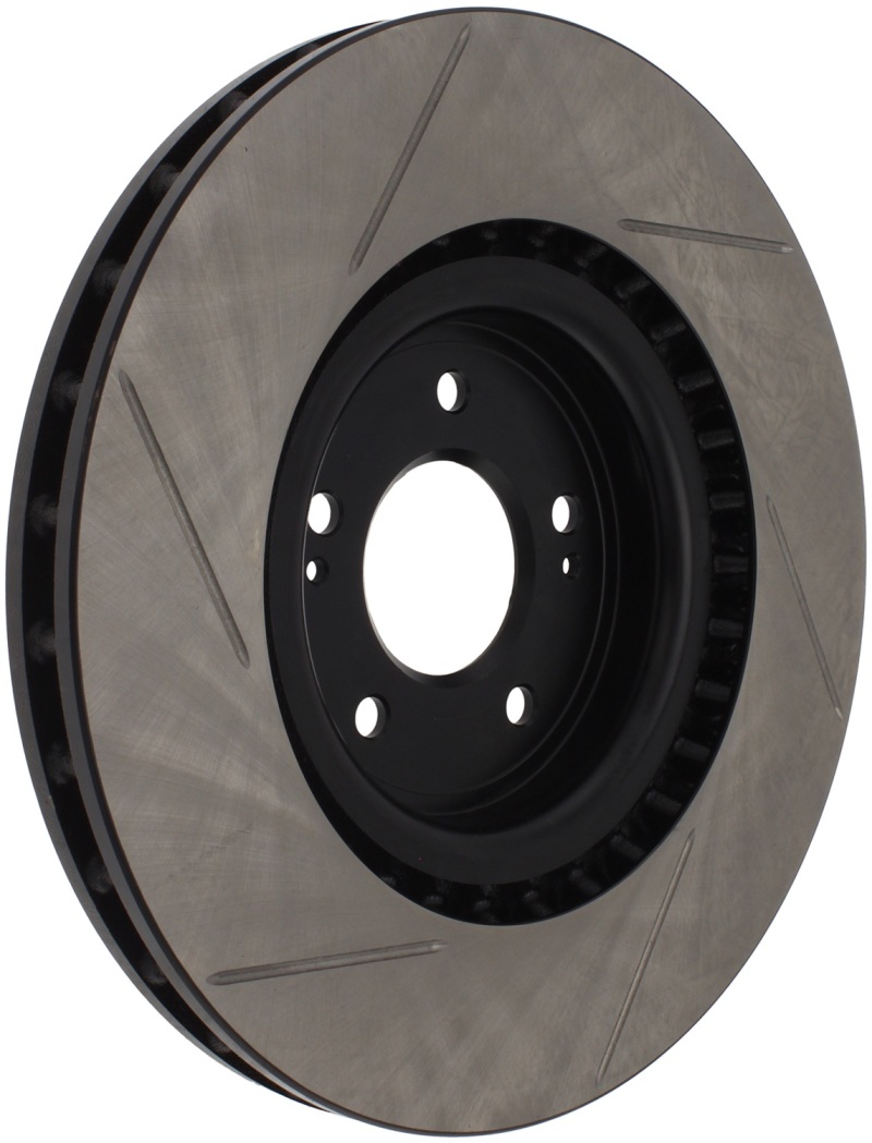 StopTech Slotted Sport Rotors are 1-piece direct replacement brake discs for factory brake systems and stock calipers that look great behind your wheels * and offer significantly improved braking performance. The unique slotting aids with heat and brake dust dispersal; prevents glazing of the pads; adds bite and improves wet and dry braking performance. Built to last; the black e-coating provides protection from corrosion and the high carbon metallurgy (in most applications) offers quieter operation; better crack resistance and increased performance.