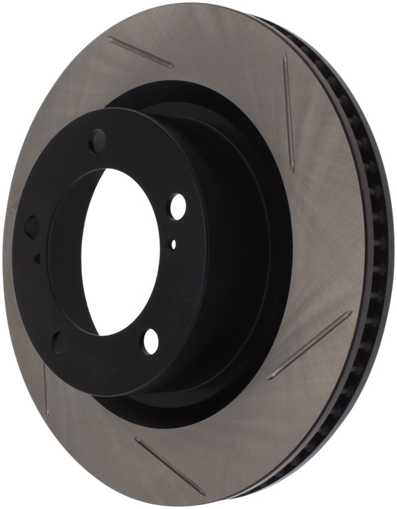 StopTech Slotted Sport Rotors are 1-piece direct replacement brake discs for factory brake systems and stock calipers that look great behind your wheels * and offer significantly improved braking performance. The unique slotting aids with heat and brake dust dispersal; prevents glazing of the pads; adds bite and improves wet and dry braking performance. Built to last; the black e-coating provides protection from corrosion and the high carbon metallurgy (in most applications) offers quieter operation; better crack resistance and increased performance.