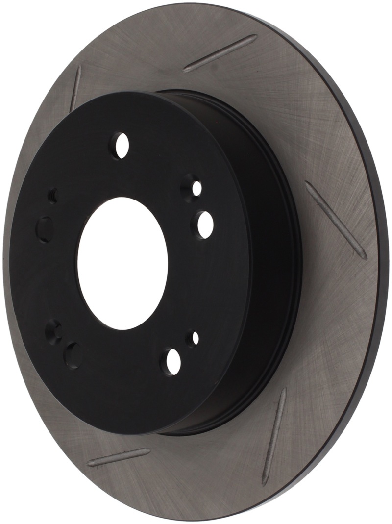 StopTech Slotted Sport Rotors are 1-piece direct replacement brake discs for factory brake systems and stock calipers that look great behind your wheels * and offer significantly improved braking performance. The unique slotting aids with heat and brake dust dispersal; prevents glazing of the pads; adds bite and improves wet and dry braking performance. Built to last; the black e-coating provides protection from corrosion and the high carbon metallurgy (in most applications) offers quieter operation; better crack resistance and increased performance.
