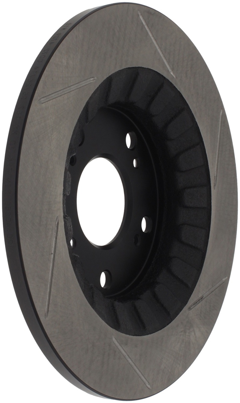 StopTech Slotted Sport Rotors are 1-piece direct replacement brake discs for factory brake systems and stock calipers that look great behind your wheels * and offer significantly improved braking performance. The unique slotting aids with heat and brake dust dispersal; prevents glazing of the pads; adds bite and improves wet and dry braking performance. Built to last; the black e-coating provides protection from corrosion and the high carbon metallurgy (in most applications) offers quieter operation; better crack resistance and increased performance.