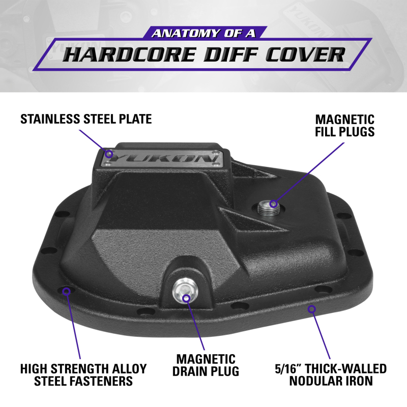 Yukon Hardcore Diff Covers are constructed from thick-walled, high-strength ductile nodular iron to protect lockers, gears, and axles from the most severe impacts that tough trails can dish out.